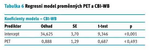 V práci bylo uvažováno, že svoji roli při rozvoji syndromu vyhoření může mít empatie jako faktor ovlivňující chápání utrpení a prožitků. Míra empatie by mohla být jedním z protektivních faktorů. Z grafu 9 vyplývá, že tato úvaha je pouze částečně správná, empatie nemá významný vliv na rozvoj syndromu vyhoření. Závislost mezi proměnnými vyjadřuje tab. 6 (p = 0,493), proto na této hladině významnosti lze tvrdit, že CBI-WB je hraničně lineárně závislá na PET. Pearsonův korelační koeficient je R = 0,0485, vztah proměnných není významně silný.