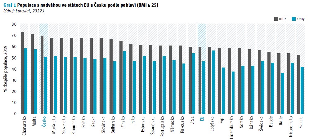 Podle Světové zdravotnické organizace (WHO) umírá od roku 2012 na světě více lidí kvůli nadbytku jídla než jeho nedostatku. Rizika spojená s obezitou dokonce překonávají kouření (ČOS ČLS JEP, 2018). Nadváha a obezita jsou hlavním faktorem invalidity a úmrtí v evropském regionu WHO a rizikovými faktory pro onemocnění kardiovaskulární, onkologická, respirační, pro diabetes mellitus 2. typu (DM2T) i choroby pohybového aparátu. Zhoršují kvalitu spánku a ovlivňují psychiku i sebevědomí. V současnosti žádný z 53 členských států evropského regionu WHO není na cestě ke splnění cíle zastavit nárůst obezity do roku 2025. Evropská iniciativa WHO pro sledování dětské obezity (COSI – European Childhood Obesity Surveillance Initiative) uvádí, že téměř každé třetí dítě školního věku žije s nadváhou nebo obezitou (HBSC, 2022). V Evropě se odhaduje, že 59 % dospělých a téměř jedno ze tří dětí trpí nadváhou nebo obezitou (EASO, 2022). Z grafu 1 vyplývá, že Česká republika je podle Eurostatu na 3. nejhorším místě ze zemí Organizace pro hospodářskou spolupráci a rozvoj (OECD – Organization for Economic Cooperation and Development).