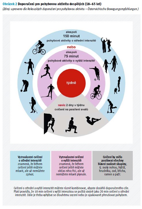 Týdně bychom měli věnovat pohybové aktivitě 150–300 min, pokud je mírná, nebo 75–150 min, pokud je intenzivní, případně obě kombinovat (Dialiga, online).