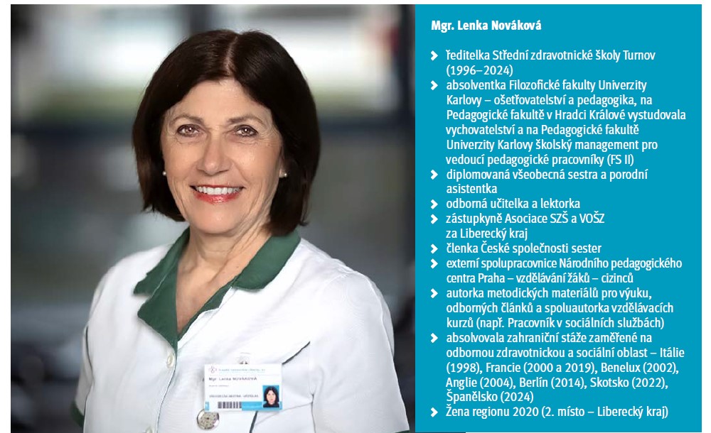 Lenka Nováková pracuje a vytváří svět k lepšímu s pokorou. Podává pomocnou ruku vždy tam, kde je potřeba. Ctí spolupráci a solidaritu, má v úctě pracovitost, vzdělání, odbornost, kreativitu a miluje svoji práci. Protože své pracovní cíle naplňuje s nadšením, jsou její úspěchy vidět na každém kroku. V rámci sředoškolského odborného vzdělávání vybudovala na SZŠ Turnov především velmi pestrou nabídku studijních oborů – Praktická sestra, Zdravotnické lyceum, Masér ve zdravotnictví, Sociální činnost a Ošetřovatel. Vhodně zvolená a v systému zdravotnického vzdělávání pevně ukotvená oborová nabídka přilákala za poslední roky nebývale velký zájem uchazečů o studium. Maturitní obor Zdravotnické lyceum jako jediný v Libereckém kraji připravuje absolventy především na vysokoškolské studium v oblasti lékařských i nelékařských oborů, případně na studium VOŠ. Maturitní obory Praktická sestra, Masér ve zdravotnictví a Sociální činnost připravují absolventy na pracovní pozice ve zdravotnických a sociálních zařízeních nebo na další vzdělávání. Neméně potřebný učební obor Ošetřovatel pak zaručuje absolventům ucházet se o pracovní pozice ve zdravotnických a sociáních zařízeních a nejúspěšnější z nich mohou pokračovat dále v maturitním vzdělávání. Prioritami a zásadami úspěšného řízení organizace a vedení pedagogického sboru pod taktovkou paní ředitelky bylo zachovávat přátelské prostředí a stabilitu, prohlubovat kvalifikaci, reagovat na nové trendy ve výuce a naplňovat je tak, aby reagovaly na poptávku na trhu práce. Z hlediska řízení pedagogického procesu pro ni vždy bylo a je důležité pracovat intenzivně se zásadami Delorsových pilířů – učit se poznávat, učit se jednat a pracovat, učit se žít a učit se být s ostatními lidmi. Z hlediska personalistiky se paní ředitelce podařilo vybudovat kvalitní pedagogický sbor, který po všech stránkách splňuje odborné a kvalifikační předpoklady pro výkon profese. Ve škole působí jak pedagogové všeobecně vzdělávacích předmětů, tak úspěšná skupina odborných pedagogů – všeobecné sestry, fyzioterapeuti, záchranáři i sociální pracovníci. Škola má také dostatek učitelů, kteří absolvovali studium specializovaných činností (výchovné poradenství, koordinátor v oblasti ŠVP, ICT, prevence sociáně-patologických jevů, činnost v oblasti environmentální výchovy, vzdělání v organizaci META pro podporu žáků cizinců, vzdělání v biografické péči pro sociální oblast, kritické myšlení, mentoring, vzdělávání na NPI „Chci být uvádějícím učitelem aneb jak mohu podpořit začínajícího kolegu“, praktické cvičení v rámci projektu „Zvyšování ochrany škol a školských zařízení jako měkkých cílů“, využití AI ve výuce, wellbeing pro žáky i pracovníky aj.). Samozřejmostí také je, že škola využívá práce školního psychologa a profesního kariérového poradce. Mezi zefektivnění pedagogického procesu a práce patří za poslední roky skutečnost, že někteří učitelé do běžné výuky úspěšně implementovali projektovou, tandemovou výuku a metodu CLIL. Vypracovávají pečlivě individuální vzdělávací plány a intenzivně se svými žáky pracují. Velkou předností je bezpochyby fakt, že škola dosahuje v dlouhodobém časovém horizontu velmi dobrých výsledků u maturitních zkoušek. V posledním období se organizace zaměřuje na posílení duševního zdraví učitelů, změny výuky ICT a zapojila se do pokusného ověřování stupňovitého propojení vybraných oborů kategorie H, M, N ve skupině oborů 53 – zdravotnictví ve SŠ a VOŠ. Na tvorbě koncepce pracovala paní ředitelka jako členka zainteresované školy i aktivní členka pracovního týmu MŠMT. Výrazné a četné úspěchy mají samotní žáci školy. Jenom za poslední období obdrželi celou řadu ocenění – např. Zlatý masér, Soutěž v poskytování první pomoci, Společná cesta k podnikavosti na školách „Firmičky“ – držitelé ocenění za firmičku s názvem Agentura domácí péče podnikateli Libereckého kraje, první místo v krajském finále Středoškolského atletického poháru aj. Žáci i odborné učitelky se tradičně zapojují do aktivního členství Českého červeného kříže – škola má nejpočetnější skupinu členů v okrese Semily. Na půdě školy působí také skupina dobrovolníků, která poskytuje péči v Domově důchodců Pohoda. V průběhu školního roku participuje zdravotnická škola přibližně na deseti charitativních sbírkách a podporuje prosociální chování občanů. Učitelské noviny uveřejnily opakovaně úspěchy žáků a školy (naposledy v lednu 2024 – Jeli jsme pečovat o druhé do Irska). Škola se také pyšní malým muzeem s jedinečnou sbírkou historických zdravotnických pomůcek, které mapují vývoj zdravotnictví a ošetřovatelské péče ve 2. polovině 20. století. Střední zdravotnická škola Turnov získala právem ocenění Škola roku Libereckého kraje za rok 2011 a Střední roku 2019.