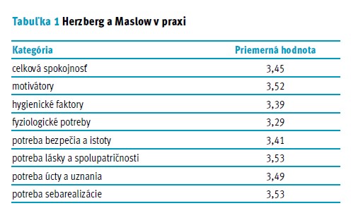 V tab. 1 je vidieť, že najviac sú sestry spokojné s motivátormi podľa Herzbergovej kategórie a so sebarealizáciou a personálnymi vzťahmi s kategórie Maslowovej pyramídy.