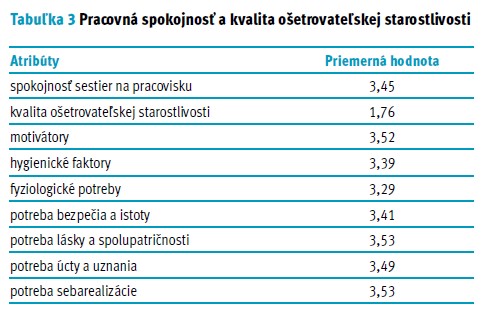 Fúziou oboch dotazníkov a hľadaním korelácií medzi dvomi premennými „pracovná spokojnosť sestier a kvalita poskytovanej ošetrovateľskej starostlivosti na oddeleniach OAIM“ som dospela k záveru, ktorý je uvedený v tab. 3.