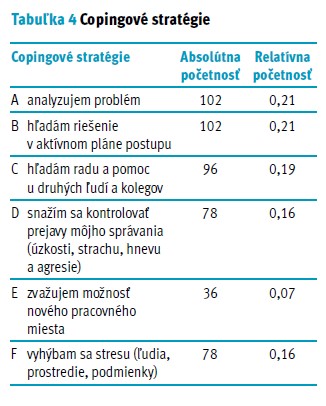 K zaujímavým záverom som dospela otázkou č. 27 dotazníku č. 1, ktorá bola venovaná copingovým stratégiám sestier, či uprednostňujú stratégiu zameranú na problém, emócie, alebo uprednostňujú únikovú stratégiu. Ponúknuté odpovede A, B boli vymedzené pre coping so stratégiou na problém, odpovede C,D pre coping so stratégiou na emócie a odpovede E a F pre únikový coping (tab. 4).