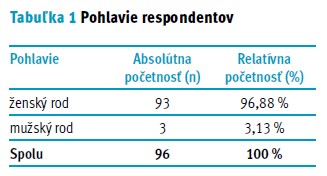 Väčšina respondentov nášho prieskumu sú ženy – až 93 (96,88 %). Mužský rod označili 3 (3,13 %) respondenti. Tieto údaje potvrdzujú výraznú prevahu žien v našom súbore (tab. 1).