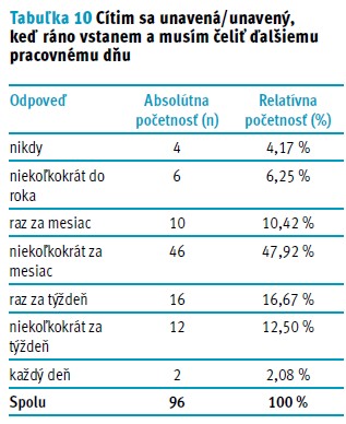 Na výrok „Cítim sa unavená/unavený, keď ráno vstanem a musím čeliť ďalšiemu pracovnému dňu“ odpovedalo 46 (47,92 %) respondentov možnosťou „niekoľkokrát za mesiac“, 16 (16,67 %) označilo odpoveď „raz za týždeň“. Ďalších 12 (12,50 %) respondentov uviedlo, že sa tak cítia „niekoľkokrát za týždeň“ a 10 (10,42 %) označilo odpoveď „raz za mesiac“. Možnosť „niekoľkokrát do roka“ zvolilo 6 (6,25 %) respondentov, „nikdy“ uviedli 4 (4,17 %) respondenti a 2 (2,08 %) respondenti sa takto cítia „každý deň“. Z uvedených údajov vyplýva, že pravidelný výskyt rannej únavy je medzi respondentmi pomerne častý, pričom takmer polovica z nich ju pociťuje opakovane počas mesiaca (tab. 10).