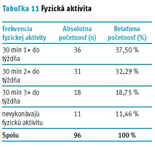 Na otázku „Ako často vykonávate fyzickú aktivitu / cvičíte?“ uviedlo najviac respondentov, že sa venujú pohybu 30 min 1× do týždňa, túto možnosť označilo 36 (37,50 %) respondentov. Vykonávanie fyzickej aktivity 2× týždenne uviedlo 31 (32,29 %) respondentov a 18 (18,75 %) respondentov ju realizuje 3× týždenne. Zostávajúcich 11 (11,46 %) respondentov fyzickú aktivitu nevykonáva vôbec. Výsledky naznačujú, že väčšina respondentiek má určitú mieru fyzickej aktivity, hoci prevažne v nižšej frekvencii, čo môže mať významný dopad na zvládanie stresu a prevenciu syndrómu vyhorenia (tab. 11).