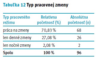 Na otázku „Aký je typ Vašej pracovnej zmeny?“ 68 (70,83 %) respondentov uviedlo že pracuje na zmeny. Ďalších 26 (27,08 %) respondentov pracuje výlučne počas denných zmien a 2 (2,08 %) respondenti deklarovali, že vykonávajú iba nočné zmeny. Z výsledkov vyplýva, že prevažná väčšina z nich pracuje v zmenovej prevádzke, čo môže mať významný vplyv na ich pracovné zaťaženie a psychickú pohodu (tab. 12).