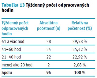 Na otázku „Aký je Váš týždenný počet odpracovaných hodín?“ odpovedalo najviac respondentov, že pracujú 61 a viac hod týždenne – túto možnosť zvolilo 38 (39,58 %) respondentov. Ďalších 34 (35,42 %) respondentov uviedlo, že odpracujú 41 až 60 hod za týždeň, 21 až 40 hod týždenne pracuje 22 (22,92 %) respondentov a len 2 (2,08 %) respondenti uviedli, že pracujú menej ako 20 hod týždenne. Tieto údaje poukazujú na vysoké pracovné zaťaženie zdravotníckeho personálu, pričom viac než tri štvrtiny respondentov odpracujú týždenne nad rámec štandardného pracovného času (tab. 13).