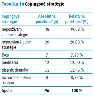 Na otázku „Aké copingové stratégie používate na prevenciu vyhorenia?“ odpovedalo 38 (39,58 %) respondentov, že nepoužívajú žiadne stratégie. Ďalších 20 (20,83 %) uviedlo, že žiadne stratégie nepoznajú, čo poukazuje na nízku informovanosť o možnostiach zvládania psychickej záťaže. Z konkrétnych foriem zvládania stresu uviedlo meditáciu 12 (12,50 %) respondentov, písanie denníka 11 (11,46 %), jógu 7 (7,29 %) a rozhovor s blízkou osobou 8 (8,33 %) respondentov. Tieto výsledky naznačujú, že väčšina z opýtaných copingové stratégie buď aktívne nevyužíva, alebo nemá dostatok poznatkov o ich možnostiach, čo môže zvyšovať ich zraniteľnosť voči pracovnej záťaži a vyhoreniu (tab. 14).