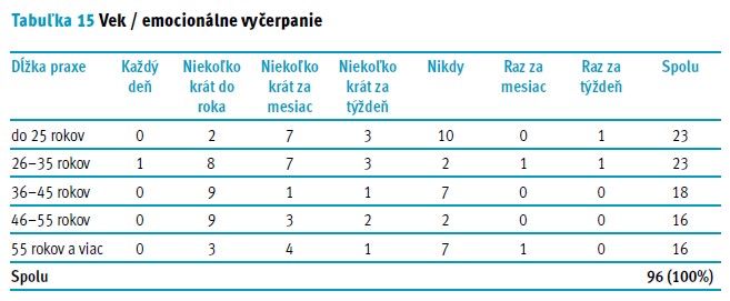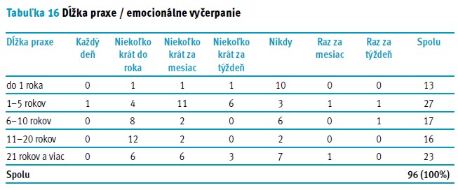Komparáciou sme zistili, že vzhľadom na dĺžku praxe je emocionálne vyčerpanie u respondentov s dĺžkou praxe do 1 roka u 3 respondentov. U respondentov s dĺžkou praxe od 1 do 5 rokov je emocionálne vyčerpaných 22 respondentov, u respondentov s dĺžkou praxe od 6 do 10 rokov je emocionálne vyčerpaných 10 respondentov, u respondentov s dĺžkou praxe od 11 do 20 rokov je počet respondentov emocionálne vyčerpaných v počte 14 a u respondentov s 21 a viac ročnou dĺžkou praxe v počte 15. Vyšší výskyt symptómov syndrómu vyhorenia možno pozorovať u respondentov s vyššou dĺžkou klinickej praxe (tab. 16).