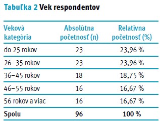 Na otázku „Aký je Váš vek?“ odpovedalo najviac respondentov v kategóriách do 25 rokov a 26–35 rokov, zhodne po 23 (23,96 %). Veková skupina 36–45 rokov bola zastúpená 18 (18,75 %) respondentmi, nasledovaná kategóriami 46–55 rokov a 56 rokov a viac, v ktorých bolo po 16 (16,67 %) respondentov. Údaje naznačujú rovnomerné vekové rozloženie s miernou prevahou mladších sestier, čo môže ovplyvniť aj ich subjektívne vnímanie pracovnej záťaže a skúsenosti s vyhorením (tab. 2).