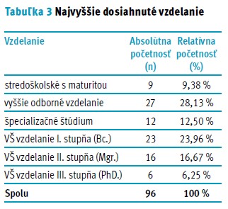 Na otázku „Aké je Vaše najvyššie dosiahnuté vzdelanie?“ najčastejšie respondenti uvádzali vyššie odborné vzdelanie – 27 (28,13 %) a vysokoškolské vzdelanie I. stupňa (Bc.) – 23 (23,96 %). Ďalej nasledovali odpovede VŠ vzdelanie II. stupňa (Mgr.) u 16 (16,67 %) respondentov a špecializačné štúdium, ktoré označilo 12 (12,50 %) respondentov. Stredoškolské vzdelanie s maturitou uviedlo 9 (9,38 %) respondentov a vysokoškolské vzdelanie III. stupňa (PhD.) uviedlo 6 (6,25 %) respondentov. Tieto výsledky poukazujú na vysokú mieru kvalifikačnej úrovne v sledovanom súbore, pričom viac než polovica z opýtaných disponuje vysokoškolským alebo odborným vzdelaním (tab. 3).