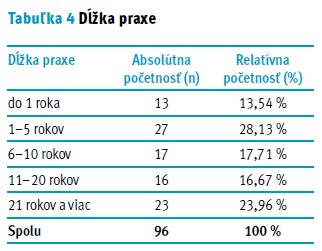 Na otázku „Aká je dĺžka Vašej praxe?“ najviac respondentov odpovedalo, že pracujú v odbore 1–5 rokov, čo uviedlo 27 (28,13 %) respondentov. Ďalej nasledovali odpovede 21 rokov a viac s počtom 23 (23,96 %) a 6–10 rokov, ktoré označilo 17 (17,71 %) respondentov. Dĺžku praxe 11–20 rokov uviedlo 16 (16,67 %) respondentov a do 1 roka označilo 13 (13,54 %) respondentov. Dáta naznačujú, že vzorka zahŕňa pomerne vyvážené zastúpenie respondentov s rôznou dĺžkou praxe, pričom mierne prevažuje skupina s kratším profesionálnym pôsobením (tab. 4).