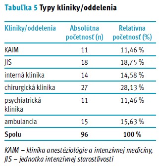 Na otázku „Na akom oddelení pracujete?“ najčastejšie respondenti uvádzali chirurgickú kliniku, ktorú označilo 27 (28,13 %) respondentov. Nasledovala jednotka intenzívnej starostlivosti (JIS) so zastúpením 18 (18,75 %) respondentov a ambulancia, kde pracuje 15 (15,63 %) respondentov. Na internej klinike pracuje 14 (14,58 %) respondentov, kliniku anestéziológie a intenzívnej medicíny (KAIM) a psychiatrickú kliniku uviedlo zhodne po 11 (11,46 %) respondentov. Výsledky poukazujú na rozmanité zastúpenie rôznych pracovných prostredí, pričom najväčší podiel z opýtaných pracuje v chirurgickom odbore (tab. 5).