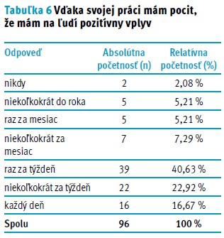 Na výrok „Vďaka svojej práci mám pocit, že mám na ľudí pozitívny vplyv“ najčastejšie respondenti odpovedali možnosťou „raz za týždeň“, ktorú uviedlo 39 (40,63 %) respondentov. Ďalších 22 respondentov (22,92 %) zvolilo odpoveď „niekoľkokrát za týždeň“ a 16 (16,67 %) uviedlo, že tento pocit zažívajú „každý deň“. Zriedkavejšie sa vyskytli odpovede „niekoľkokrát za mesiac“ – 7 respondentov (7,29 %), „niekoľkokrát do roka“ a „raz za mesiac“ zhodne odpovedali 5 (5,21 %) respondenti. Možnosť „nikdy“ zvolili 2 (2,08 %) respondenti. Výsledky naznačujú, že väčšina respondentov vníma svoju prácu ako významne prispievajúcu k blahu pacientov a má pocit pozitívneho vplyvu, čo môže prispievať k ich osobnému uspokojeniu a motivácii pri výkone profesie (tab. 6).