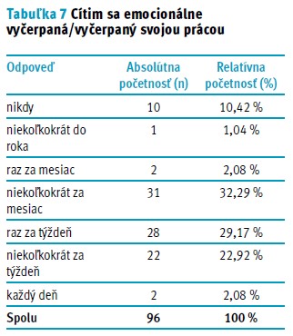 Na otázku „Cítim sa emocionálne vyčerpaná/vyčerpaný svojou prácou“ odpovedalo 10 (10,42 %) respondentov „nikdy“, zatiaľ čo iba 1 (1,04 %) respondent označil možnosť „niekoľkokrát do roka“. Odpoveď „raz za mesiac“ uviedli 2 (2,08 %) respondenti, „niekoľkokrát za mesiac“ 31 (32,29 %), „raz za týždeň“ 28 (29,17 %) a „niekoľkokrát za týždeň“ 22 (22,92 %) respondentov. Možnosť „každý deň“ označili 2 (2,08 %) respondenti. Výsledky naznačujú, že viac ako polovica respondentov pociťuje emocionálne vyčerpanie najmenej raz za týždeň, pričom len menšia časť uvádza jeho výskyt zriedkavo alebo vôbec. Tieto údaje môžu signalizovať vysoké riziko psychickej záťaže a potenciálneho syndrómu vyhorenia u značnej časti súboru (tab. 7).