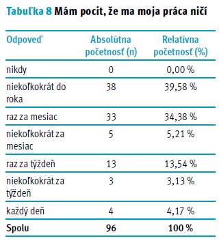 Na výrok „Mám pocit, že ma moja práca ničí“ uviedlo 38 (39,58 %) respondentov odpoveď „niekoľkokrát do roka“ a 33 (34,38 %) respondentov označilo možnosť „raz za mesiac“. Možnosť „raz za týždeň“ zvolilo 13 (13,54 %) respondentov, „niekoľkokrát za mesiac“ 5 (5,21 %) respondentov a „každý deň“ 4 (4,17 %) respondenti. Možnosť „niekoľkokrát za týždeň“ označili 3 (3,13 %) respondenti, pričom odpoveď „nikdy“ nezvolil žiadny respondent (0,00 %). Výsledky poukazujú na to, že prevažne ide o občasný výskyt negatívneho vnímania práce, avšak takmer štvrtina opýtaných zažíva tento pocit pravidelne, čo môže naznačovať dlhodobý psychický tlak a riziko vyhorenia (tab. 8).
