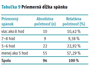 Na otázku „Koľko hodín priemerne spíte?“ menej ako 5 hod spia odpovedalo 55 (57,29 %) respondentov, čo predstavuje najvyšší podiel odpovedí. Spánok v rozmedzí 5 až 6 hod uviedlo 22 (22,92 %) respondentov. Len 9 (9,38 %) respondentov uviedlo, že spia 7 až 8 hod a viac ako 8 hod označilo ako svoj priemer 10 (10,42 %) respondentov. Tieto výsledky poukazujú na výrazne skrátenú dĺžku spánku u väčšiny respondentov, čo môže mať negatívny dopad na regeneráciu organizmu a celkovú psychickú pohodu, najmä pri práci v náročných zdravotníckych podmienkach (tab. 9).