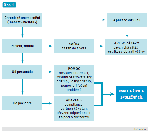 Schéma pacienta s chronickým onemocněním (viz obr. 1) je důležité, abychom se uměli vcítit do role pacienta s chronickým onemocněním, v tomto případě s cukrovkou, u kterého byla zahájena intenzivní léčba inzulinem. Co představuje toto onemocnění nejen pro pacienta, ale také pro celou rodinu?