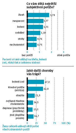 Na otázky, jak pacient svou nemoc prožívá, jak je na ni adaptovaný, zda o ní má dostatek infomací a zda má k personálu důvěru, stejně jako jestli pacient trpí nějakými fyzickými či psychickými obtížemi, neměli dosud nefrologové komplexní pohled. Průzkum ukázal, že největšími a nejčastěji udávanými subjektivními stesky pacientů byly žízeň a nespavost. Ženy celkově udávají větší počet obtíží než muži. Nejčastěji upozorňují na bolesti pohybového aparátu (47 % popisuje bolesti zad, 42,8 % bolesti kloubů). Depresivní nálady, úzkost a pocity beznaděje uvedlo 24,5 % dotazovaných. Většinou šlo o ženy a pacienty ve věkové kategorii do 60 let. Téměř polovina pacientů uvedla, že jejich fyzická výkonnost se po zahájení dialyzačního programu zhoršila.