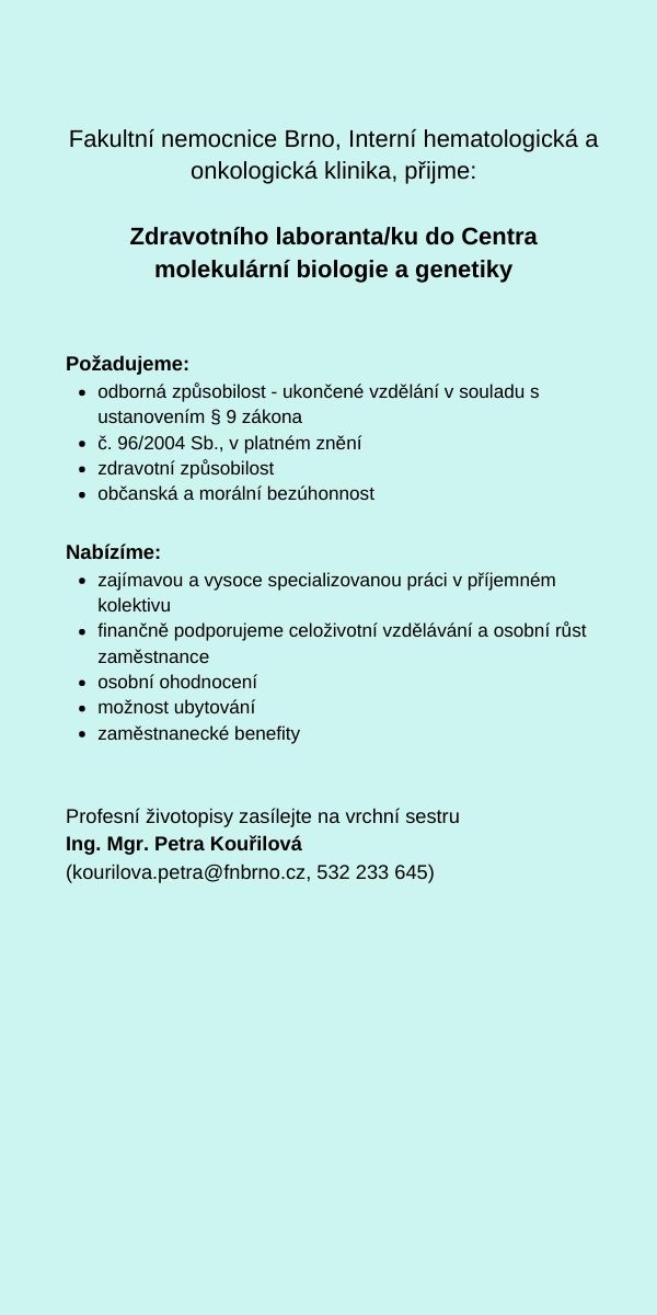 Zpět na přehled zaměstnání Zdravotní laborant/ka do Centra molekulární biologie a genetiky, FN Brno |
