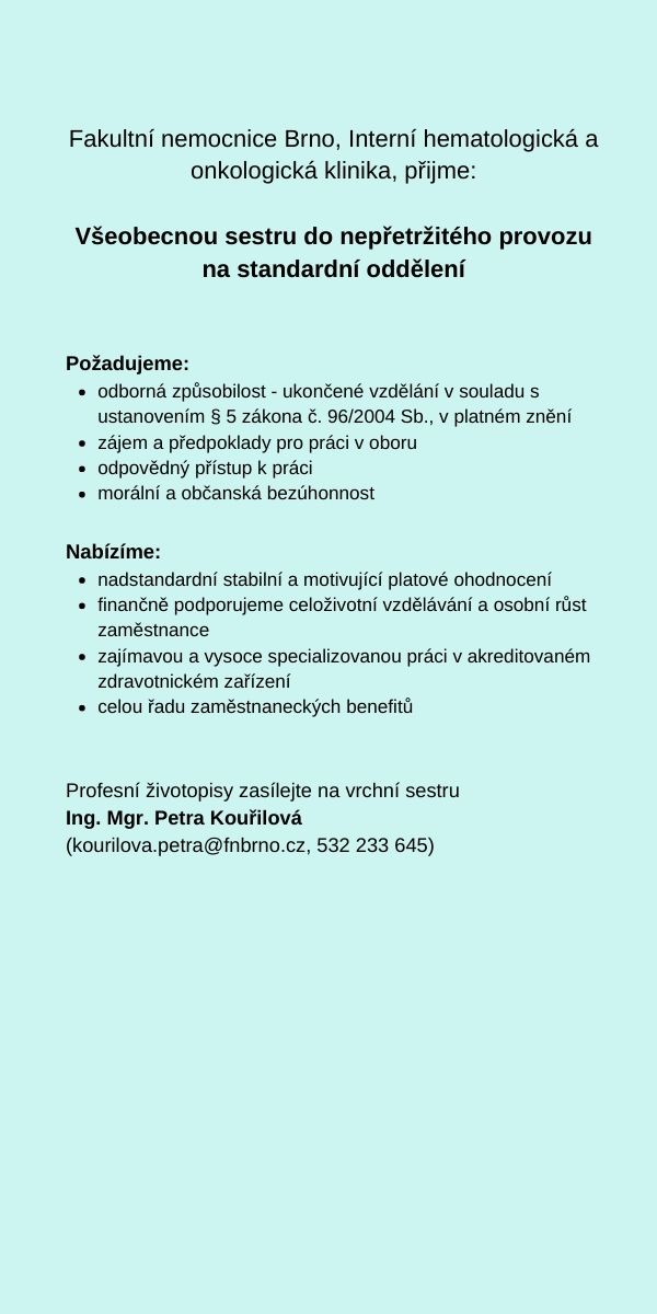 Zpět na přehled zaměstnání Všeobecná sestra do nepřetržitého provozu na standardní oddělení, FN Brno |