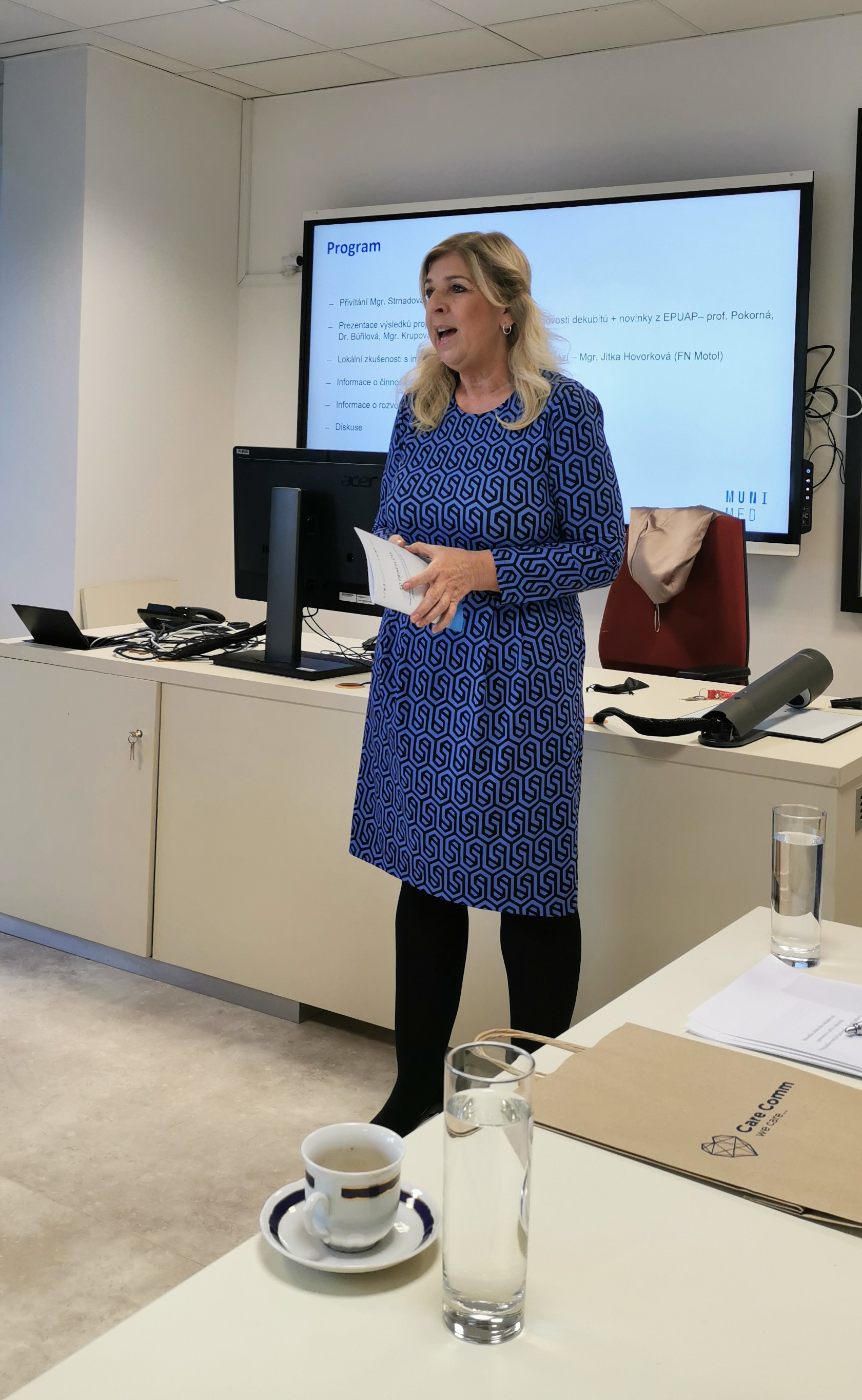 Dále byly prof. Pokornou, jménem celého projektového týmu, prezentovány výsledky projektu Analýza nákladovosti léčby dekubitů – determinanty péče (NU20-09-00094). V první fázi studie byla provedena analýza publikovaných výzkumných prací, v rámci které byly zjištěny nedostatky studií s kompletními ekonomickými výsledky týkající se prevence a léčby dekubitů (především byly analyzovány „přímé“ náklady na péči). Hlavním cílem projektu bylo standardizovat ošetřovatelské postupy v péči o pacienty s dekubity na národní úrovni a vytvořit ekonomický model, při kterém by bylo možné je strategicky plánovat. Na základě identifikace materiálů k fázovému hojení ran a ošetřovatelských činností by následně byla iniciována úprava úhrad v prevenci a léčbě tlakových lézí. Na základě výsledků studie je možné uvést, že náklady na léčbu dekubitů bez preventivních opatření jsou 2krát až 3krát vyšší ve srovnání s léčbou dekubitů bez realizace preventivních strategií. Aktuálně probíhá příprava a finalizace metodiky pro sledování nákladů léčby tlakových lézí (dekubitů/proleženin) tak, aby byly podpořeny investice na prevenci a vhodné léčebné strategie.