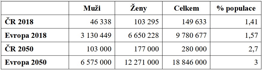 Odhad prevalence demence v ČR a v Evropě v roce 2050 (Zdroj: studie Alzheimer Europe 2019, www.alzheimer.cz)
