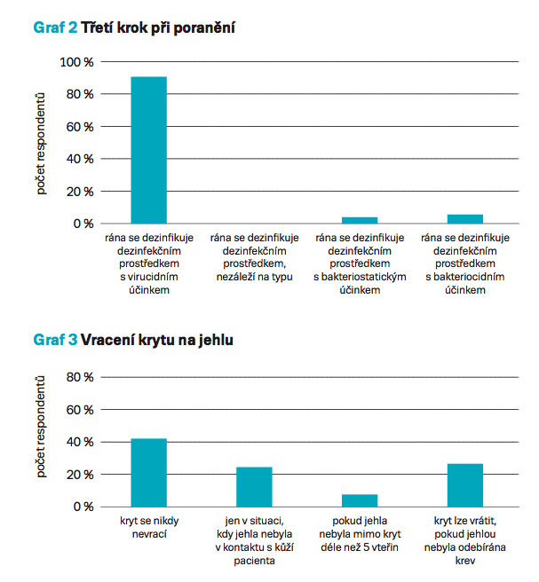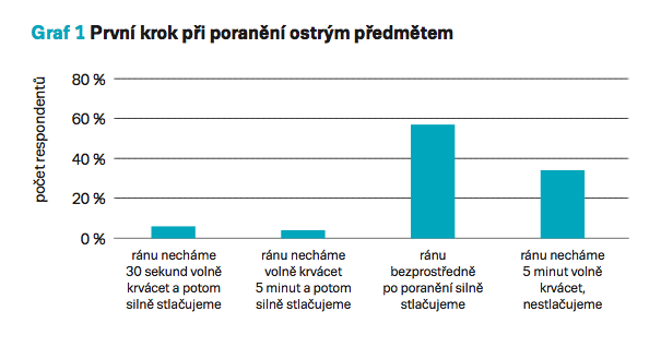 Velmi zajímavé zjištění přinesla otázka týkající seprvníhokroku přiošetření poranění o ostrý předmět. Zde pouze 18 (34 %) respondentů odpovědělo správně, že se rána má nechat pětminut volně krvácet a nijak nemačkat, jak uvádí Jilich (2014). Domníváme se, že důvodem pro tolik nesprávných odpovědí je přetrvávání zastaralých informací. V minulosti některé publikace uváděly, že je ránu potřeba silně stlačovat, aby došlo k vytlačení potencionálního infekčního agens z tkáně zdravotnického pracovníka. Z důvodu aktualizace informací je důležité připomenout nutnost celoživotního vzdělávání zdravotnických pracovníků. Otázky týkající sedruhéhoa třetíhokroku však přinesly příznivé výsledky,kdy první otázku zodpovědělo správně 44 (83 %) respondentů a druhou48 (90,6 %) respondentů.