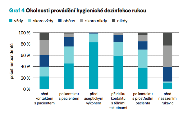 Nakonecbyly položeny ještědvě otázky: první se týkalaokolností, za nichž sepoužívají rukavice, resp.ve kterých situacích používají rukavice respondenti. 40 (75,5 %) respondentů uvedlo, že použije rukavice vždy při odebírání krve,a 43 (81,1 %) respondentů uvedlo,že použije rukavice při odběru glykemie. Druhá otázka se týkalaokolnostíprovádění hygienické dezinfekce rukou a toho,v jakých situacích ji respondenti provádějí. V situaci před tím, než budou v kontaktu s pacientem, uvedlo 12 (22,6 %) respondentů,že vždy provádějí hygienickou dezinfekci rukou. V situaci před aseptickým výkonem provede dezinfekci rukou 44 (83 %) respondentů.