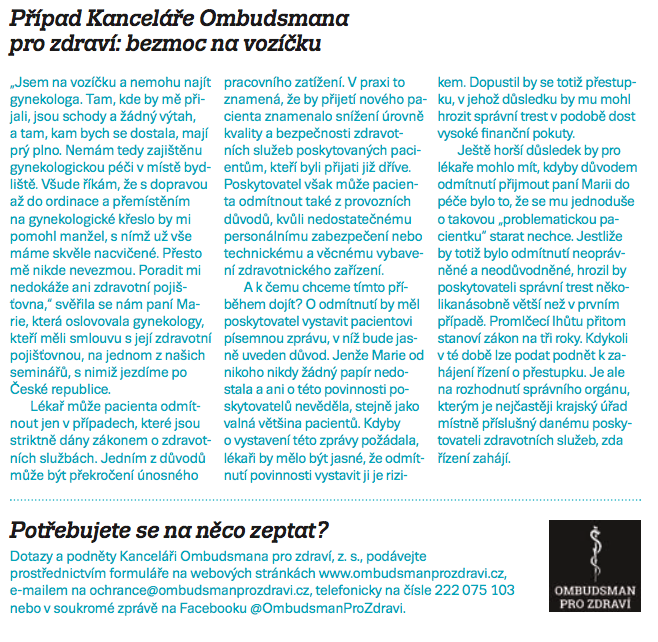 „Jsem na vozíčku a nemohu najít gynekologa. Tam, kde by mě přijali, jsou schody a žádný výtah, a tam, kam bych se dostala, mají prý plno. Nemám tedy zajištěnu gynekologickou péči v místě bydliště. Všude říkám, že s dopravou až do ordinace a přemístěním na gynekologické křeslo by mi pomohl manžel, s nímž už vše máme skvěle nacvičené. Přesto mě nikde nevezmou. Poradit mi nedokáže ani zdravotní pojišťovna,“ svěřila se nám paní Marie, kteráoslovovala gynekology, kteří měli smlouvu s její zdravotní pojišťovnou, na jednom z našich seminářů, s nimiž jezdíme po České republice.