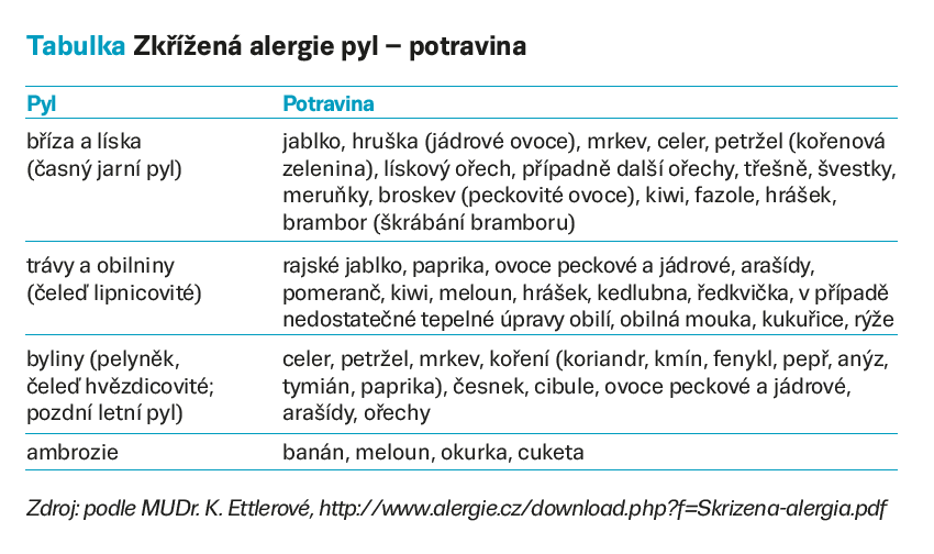 Naštěstí jsou známy nejčastější podobnosti mezi sekvencemi aminokyselin pylových alergenů a některých potravinových alergenů. Příklady zkřížené alergie pyl – potravina ukazuje tabulka.