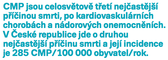 CMP jsou celosvětově třetí nejčastější příčinou smrti, po kardiovaskulárních chorobách a nádorových onemocněních. V České republice jde o druhou nejčastější příčinu smrti a její incidence je 285 CMP/100 000 obyvatel/rok. CMP je v laické i odborné komunitě vnímána jako akutní stav vyžadující maximální péči, protože dobře organizovaná akutní péče má potenciál snížit absolutní riziko smrti nebo závislosti na péči, konkrétně trombolýza o 6,3 %. Do šesti hodin od nástupu neurologického postižení lze indikovat mechanickou trombektomii, a to po individuálním posouzení stavu nemocného. Cévní mozkové příhody dělíme na ischemické a krvácivé. Toto jednoduché dělení má svoji logiku vzhledem k faktu, že příčina, prognóza i následky jsou u obou typů CMP rozdílné. Ischemické CMP jsou způsobené buď uzávěrem mozkové tepny embolem nebo trombem, krvácivé CMP jsou způsobené spontánním krvácením do mozkové tkáně (mozkové krvácení) nebo do subarachnoidálního prostoru (subarachnoidální krvácení). Ischemické cévní mozkové příhody tvoří 80 % a krvácivé 20 % všech CMP. Klinický obraz většiny je dosti podobný. Typický je rychlý rozvoj ložiskové symptomatologie podle teritoria postižení mozkové tepny: oslabení až ochrnutí končetiny nebo poloviny těla, porucha citlivosti poloviny těla, porucha řeči, závrať, nauzea nebo zvracení, dvojité vidění, výpadek zorného pole a jiné příznaky.