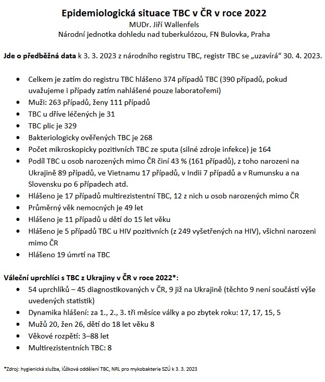 Podle nejnovějších dat vzrostl v Česku celkový počet lidí s tuberkulózou o 17 osob na loňských 374. Podle MUDr. Jiřího Wallenfelse, vedoucího Národní jednotky dohledu nad tuberkulózou FN Bulovka, to souvisí s přílivem uprchlíků z Ukrajiny. „Počet osob s TBC narozených na Ukrajině činil 89, což je o 154 % více než v roce předcházejícím,“ říká MUDr. Wallenfels.