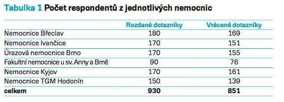 Výzkum jsem prováděla v období měsícůúnora a března roku 2018. Výzkumu se zúčastnilo 851 sester a v následující tabulce uvádím počet respondentů z jednotlivých nemocnic.