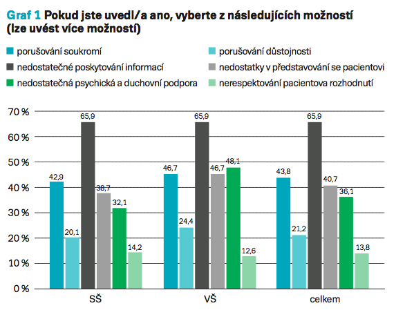 V další otázce jsem se zaměřila na konkrétní případy nedodržování práv pacientů, kteréprezentuji níže. Na nedostatečné poskytování informací pacientovi upozorňuje 66 % sester. Druhou nejčastější položkoujeporušování soukromí, které udává 44 % sester. Na třetí pozici se nacházínedostačujícípředstavování se pacientovi,na něž upozorňujenecelých 41 % sester. Dále upozorňují na nedostatečnoupsychickou a duchovní podporu–36 % sester. Na tento problém více upozorňují sestry s vysokoškolským vzděláním (48 %). Porušování důstojnostije dalšímuváděnýmporušovánímpráv, celkem ho uvedlo 21 % sester. Na nerespektování pacientových rozhodnutíupozorňuje 14 % sester. Dvě sestry se středoškolským vzděláním (0,5 %) uvedly problém sezajištěním důstojného umírání. Jedna sestra s VŠ vzděláním upozornila na neposkytování dostatku času na rozmyšlení.