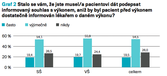 Následující položka nám přehledně ukazuje, jak často jsou sestry nuceny dát pacientovi podepsat informovaný souhlas bez poskytnutí dostatečných informací od lékaře. Více než polovina sester (55 %) se s tímto problémem setkává pouze výjimečně, 19 % dotazovaných nechává podepisovat informovaný souhlas za uvedených podmínek často. Nikdy se s touto skutečností nesetkalo jen 26 % sester. Závěrem mohu konstatovat, že celkem 74 % sester se s nísetkává buď často nebo výjimečně, což není pozitivní zjištění.