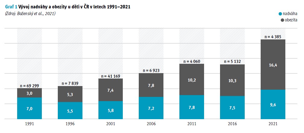 V posledních letech se u dětí výskyt obezity celosvětově výrazně zvýšil. Tato skutečnost má závažné následky, vč. psychologických, psychiatrických i psychosociálních poruch v dětství. V dospělosti pak těmto dětem hrozí rozvoj závažných metabolických komplikací. Studie „Zdraví dětí 2016“ ukázala, že v České republice po období globálního nárůstu obezity do roku 2011 nastalo období určité stagnace, kdy covidová epidemie změnila tento trend a nová data z roku 2021 ukazují výrazný nárůst dětí obezitou. Jednalo se o prospektivní sběr antropo-logických dat praktickými lékaři pro děti a dorost získaných při pravidelných preventivních vyšetřeních u 4 386 dětí od 5 let včetně. Z uvedených dat vyplývá, že nejvyšší nárůst obezity je zaznamenán u chlapců v 11 letech, kde téměř polovina populace chlapců má nadváhu a obezitu. U dívek je nevyšší nárůst ve věku 13 let. Zde je téměř 40% populace dívek s nadváhou a obezitou. Data o výskytu závažné formy obezity (nad 99. percentil) mohou znamenat riziko nárůstu výskytu metabolického syndromu již u dětí staršího školního věku (Vážná et al., 2022). Data z této studie prokazují výrazný nárůst dětské obezity ve všech sledovaných věkových skupinách ve srovnání s vývojem nadváhy a obezity u dětí v ČR v minulých letech (Boženský et al., 2020), kdy došlo k nárůstu počtu dětí s obezitou ze 3 % v roce 1991 až na hodnoty 16,4 % v roce 2021 (graf 1).