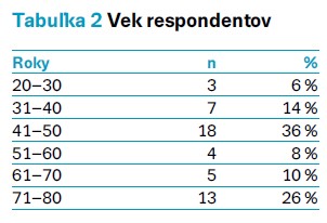 V súbore je najmenej zastúpená veková skupina 20–30 rokov a to 3 respondenti (6 %), 4 respondenti vo veku 51–60 rokov (8 %), 5 respondentov vo veku 61–70 rokov (10 %), 7 respondentov vo veku 31–40 rokov (14 %), 13 respondentov vo veku 71–80 rokov (26 %), najviac zastúpená veková skupina je od 41 do 50 rokov (36 %) (tab. 2).