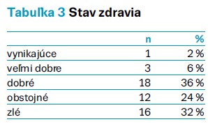 Iba 1 respondent (2 %) uviedol, že jeho zdravie je vynikajúce, 3 respondenti (6 %) uviedli, že ich zdravie je veľmi dobré, 18 respondentov (36 %) uviedlo, že sa cítia dobre, 12 respondentov (24 %) sa cítia obstojne a 16 respondentov (32 %) uviedlo, že sa cítia zle (tab. 3).