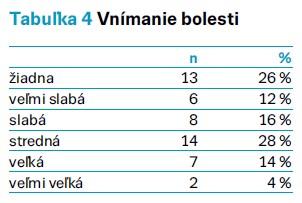 Celkom 2 respondenti (4 %) uviedli, že mali veľmi veľkú fyzickú bolesť, 7 respondentov (14 %) udali veľkú bolesť, 14 respondentov (28 %) popisovalo strednú bolesť, 8 respondentov (16 %) uviedlo slabú bolesť, 6 respondentov (12 %) popísalo veľmi slabú bolesť a zvyšných 13 respondentov (26 %) nemalo žiadnu bolesť (tab. 4).