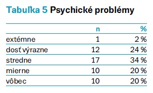 Celkom 1 respondent (2 %) odpovedal, že psychické ťažkosti mu pri spoločenských aktivitách prekážali extrémne, 12 respondentov (24 %) odpovedalo, že im prekážali psychické ťažkosti dosť výrazne pri spoločenských aktivitách, až 17 respondentov (34 %) odpovedalo, že ťažkosti ich obmedzovali stredne, 10 respondentov (20 %) uviedlo mierne ťažkosti a zvyšných 10 respondentov (20 %) uviedlo, že psychické ťažkosti nemali vôbec (tab. 5).
