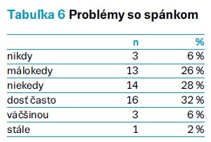 Na otázku koľko respondentov malo ťažkosti so spánkom, odpovedali 3 respondenti (6 %) že nemali ťažkosti nikdy, 13 respondentov (26 %) mali ťažkosti so spánkom málokedy, niekedy malo problémy so spánkom 14 respondentov (28 %), dosť často ťažkosti malo až 16 respon-dentov (32 %) 3 respondenti (6 %) mali ťažkosti väčšinou a len 1 respondent (2 %) mal ťažkosti znovu zaspať stále (tab. 6).