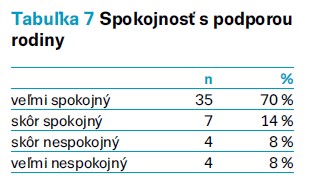 Na otázku, ako boli respondenti spokojní s podporou, ktorú dostávali od svojej rodiny a priateľov odpovedali 4 respondenti (8 %), že boli veľmi nespokojní, 4 respondenti (8 %) boli trochu nespokojní, skôr spokojní s podporou rodiny bolo 7 respondentov (14 %) a veľmi spokojných bolo až 35 respondentov (70 %) (tab. 7).