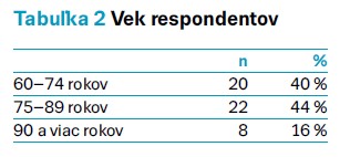 Z hľadiska veku sa prieskumu zúčastnilo 20 respondentov vo veku 60–74 rokov, čo tvorí (40 %). Vo veku 75–89 rokov bolo 22 (44 %) respondentov. Počet respondentov vo veku 90 rokov a viac bol osem (16 %) respondentov (tab. 2).