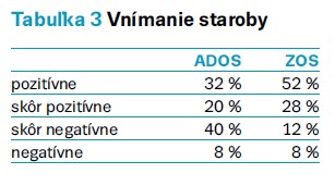 Pozitívne vnímanie staroby uviedlo z ADOS 32 % respondentov a zo ZOS 52 % respondentov. Skôr pozitívne vníma svoju starobu z ADOS 20 % respondentov a 28 % respondentov zo ZOS. Skôr negatívne vnímalo svoju starobu z ADOS 40 % respondentov a 12 % respondentov zo ZOS. Negatívne vníma prežívanie staroby 8 % respondentov z ADOS a 8 % respondentov zo ZOS (tab. 3).