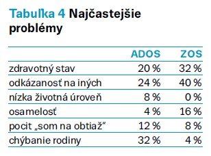 Pocit odkázanosti na druhých v ADOS uviedlo 24 % respondentov, v ZOS 40 % respondentov. Zdravotný stav ako problém v ADOS uviedlo 20 % respondentov a v ZOS 32 % respondentov. Nízka životná úroveň trápila v ADOS 8 % respondentov a v ZOS 0 % respondentov. Osamelosť ako problém uviedlo v ADOS 4 % respondentov a v ZOS 16 % respondentov. Pocit „som na obtiaž“ ako problém uviedlo v ADOS 12 % respondentov a ZOS 8 % respondentov. Rodina chýbala v ADOS 32 % respondentov a ZOS 4 % respondentov (tab. 4).