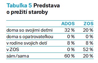 Vyhodnotenie otázky o predstavách o prežití staroby 32 % respondentov z ADOS a 20 % respondentov zo ZOS uviedlo, že si vedia predstaviť prežiť svoju starobu doma so svojimi deťmi. Prežiť starobu doma s opatrovateľkou respondenti z obidvoch zariadení uviedlo 0 %. Prežiť svoju starobu v rodine svojich detí uviedlo z ADOS 8 % a zo ZOS tiež 8 % respondentov. V sociálnom zariadení by chcelo prežiť svoju starobu z ADOS 0 % respondentov a zo ZOS 52 % respondentov. Celkom 60 % respondentov z ADOS a 20 % respondentov zo ZOS uviedlo, že chce prežiť svoju starobu sám/sama (tab. 5).