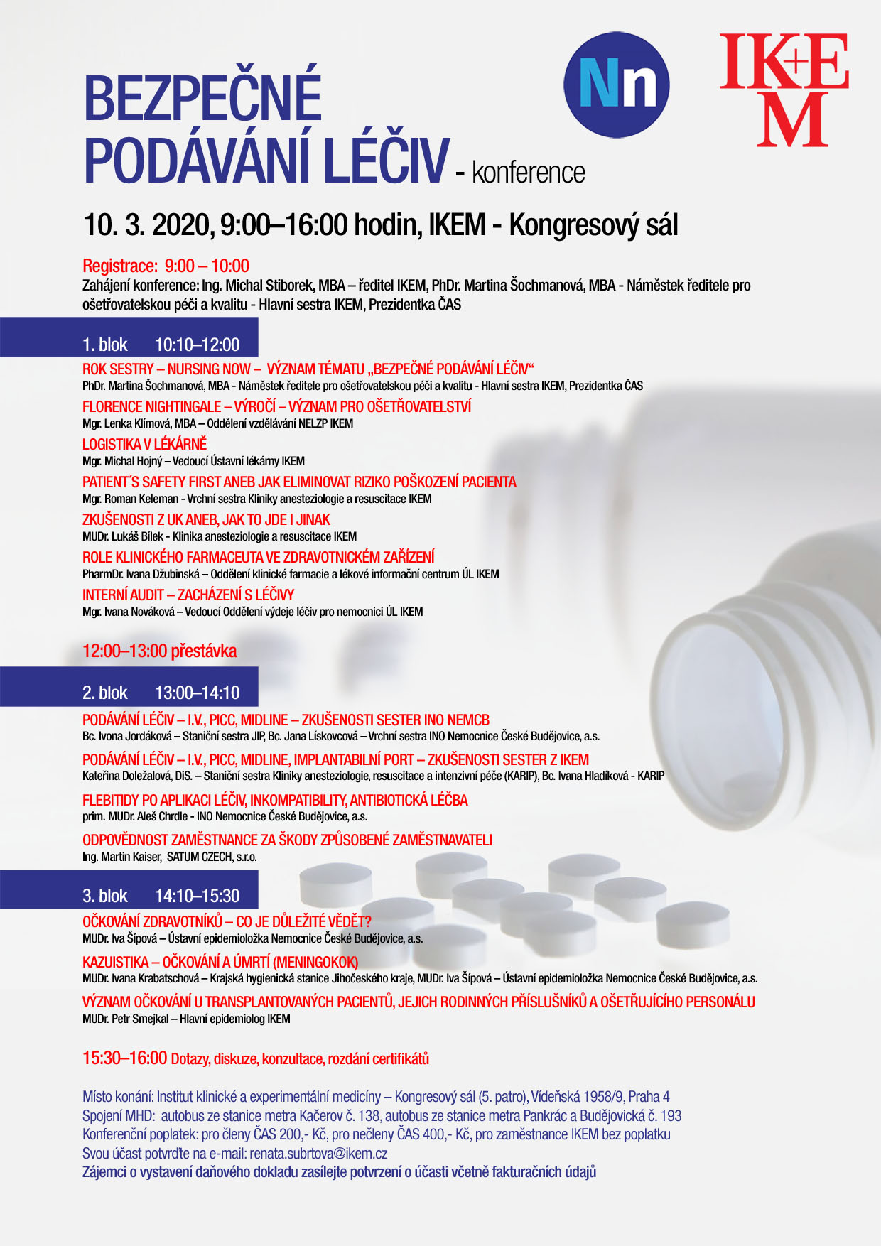 Jménem Ing. Michala Stiborka, MBA – ředitele IKEM a PhDr. Martiny Šochmanové, MBA, náměstkyně ředitele pro ošetřovatelskou péči a kvalitu, hlavní sestry IKEM a prezidentky ČAS si Vás dovolujeme pozvat na konferenci, která se uskuteční 10. března 2020 od 9.00 hod. v kongresovém sále IKEM.