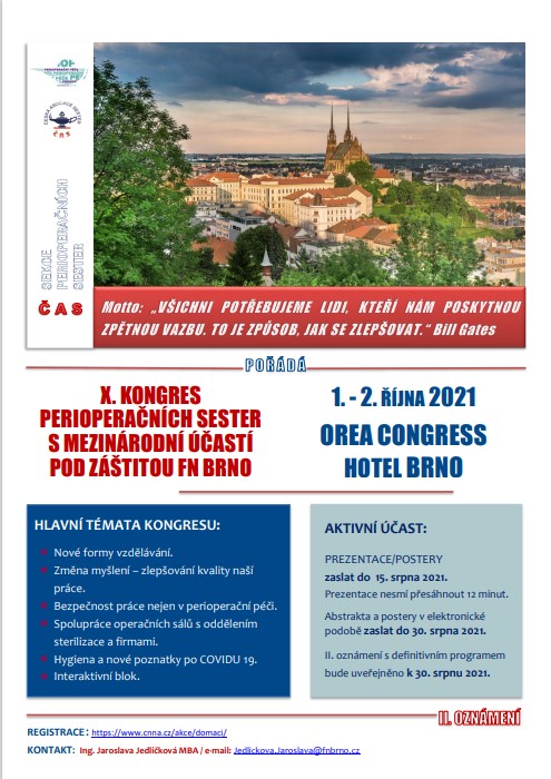 rádi bychom Vás pozvali již na X. Kongres perioperačních sester ve dnech 1.-2. 10. 2021, který plánujeme uskutečnit v Brně v hotelu OREA CONGRESS. Zatím doufáme, že situace bude příznivější a uskuteční se na místě.